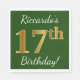 Ce design simple de serviette en papier comporte un message comme "17e anniversaire de Riccardo!", avec le "17e" à l’allure fausse or, sur un arrière - plan de couleur verte. Le nom peut être personnalisé. Il pourrait être utilisé à une fête d'anniversaire pour quelqu'un qui célèbre son dix-septième anniversaire. [~Z0000081]