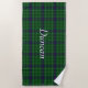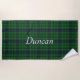 Élégante serviette de plage faite dans le classique clan écossais bleu et vert Duncan tartan plaid motif. Personnalisez le grand texte blanc, au milieu, pour répondre à vos besoins.