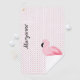 Serviette rose et blanche d'amusement de polka de point de motif de golf avec des graphiques d'un flamant de regard brouillé rose. Le texte noir fait sur commande est prêt à personnaliser pour adapter à vos besoins. Belle idée de cadeau pour le golfeur de dame.