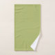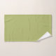 Ce kit de serviettes est doté d'un linge bleu, d'une serviette verte à la main et d'une serviette de bain aux motifs géométriques de points bleus, verts et marrons.