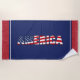 Cette serviette de plage est montrée dans une serviette bleu marine avec les extrémités en couleur parties scintillant en faux rouge et une bande solide de coordination. Possède une énorme "Amérique" dans Stars and Stripes au centre de la serviette. Customisez cet objet ou achetez tel que conçu.
