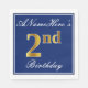 Cette conception simple et élégante de serviette en papier comporte un message comme "AnameHere’s 2nd Birthday" (avec le "2nd" ayant une fausse couleur dorée) dans une zone carré de couleur bleue avec un contour de bordure simple. Le nom est en texte de type script de couleur blanche et peut être personnalisé. Des serviettes comme celles-ci pourraient être utilisées à une fête d'anniversaire pour quelqu'un qui célèbre son deuxième anniversaire. [~Z0000141]