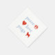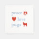 Trois lignes de mots dans une police de coque inférieure bleu clair empilés l'un sur l'autre et chacun ayant une image à côté de l'autre. Le premier mot est Paix et est accompagné d'un signe de paix rouge, le second est le mot Amour avec un grand coeur rouge et dernier est le nom de votre chien préféré élever le Carlin avec la silhouette contour des chiens remplis d'un arrière - plan rouge solide pour correspondre au reste. Ces serviettes de Carlin en papier Peace Love sont parfaites pour tous ceux qui aiment ces chiens.