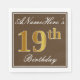 Cette conception simple et élégante de serviette en papier comporte un message comme "AnameHere’s 19th Birthday" (avec le "19th" ayant une fausse couleur dorée) dans une zone carré de couleur marron avec un contour de bordure simple. Le nom est dans un texte de type script de couleur blanche, et peut être customisé. Des serviettes comme celles-ci pourraient être utilisées à une fête d'anniversaire pour quelqu'un qui célèbre son dix-neuvième anniversaire. [~Z0000139]