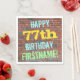 Cette conception amusante de serviette en papier sur le thème de l'anniversaire comporte un message comme "HAPPY 77th BIRTHDAY, FIRSTNAME!", où le nom peut être personnalisé. L'arrière - plan est représenté par un mur en brique composé de briques de couleur rougeâtre. Le texte du message personnalisable comporte des couleurs comme le bleu, le jaune et le vert, et il a un aspect inspiré de celui des graffitis peints. Des serviettes comme celles-ci pourraient peut-être être utilisées à une fête d'anniversaire pour quelqu'un qui célèbre son soixante-dix-septième anniversaire. [~Z0000271]
