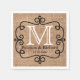 Serviettes en papier monogramme de mariage campagnard simple et élégant.Les serviettes en papier personnalisées sont imprimées de manière rustique sur papier-volumétrique dans l'arrière - plan. Personnalisez l'élégant cadre de tourbillon noir avec votre lettre monogramme, les noms de mariée et de mariée et la date mariage.