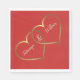 Élégantes serviettes en papier pour mariage asiatique inspiré, réalisées en rouge avec des graphiques de deux coeurs or entrelacés. Personnalisez avec les noms des mariés.