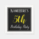 Cette conception simple et élégante de serviette en papier comporte un message comme "NameHere’s 5th Birthday Party", avec le "5th" dans un texte de couleur jaune raffiné, dans une zone carré de couleur noire avec un contour de bordure simple. Un nom personnalisé peut être utilisé. Des serviettes comme celles-ci pourraient être utilisées à une fête d'anniversaire pour quelqu'un qui célèbre son cinquième anniversaire. [~Z0000150]