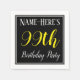 Cette conception simple et élégante de serviette en papier comporte un message comme "Name-Here’s 99th Birthday Party", avec le "99th" en texte jaune raffiné, dans une zone carré de couleur noire avec un contour de bordure simple. Un nom personnalisé peut être utilisé. Des serviettes comme celles-ci pourraient peut-être être utilisées à une fête d'anniversaire pour quelqu'un qui célèbre son quatre-vingt-dix-neuvième anniversaire. [~Z0000150]
