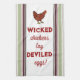 Cette serviette de cuisine a des rayures sur la longueur des deux côtés, un poulet et "les poulets méchants pondent des oeufs dévités !" en dessous. Crédit artistique : RedPepper. Profitez de vos nouvelles serviettes de cuisine Stripes and Wicked Chickens!