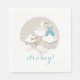 serviettes de baby shower avec illustration d'une cigogne dans les nuages avec faisceau bleu. Le texte dit : "C'est un garçon"