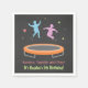Fête fournit des serviettes en papier pour une fête d'anniversaire sur le terrain de jeu de trampoline ! Le design est dans une palette de couleurs pastel qui contraste agréablement avec la texture gris arrière - plan noir. On peut voir des silhouettes d'enfants rebondir sur le trampoline. Ajoutez le titre en texte vert.