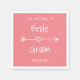Serviettes mariages en papier de style bohème rose corail. Couleur arrière - plan personnalisable. Fournitures de partie jetable avec typographie manuscrite vintage et flèche de coeur avec petites plumes. Ajoutez votre propre nom de mariée et de mariée, monogramme, date du mariage et citation d'amour. Conception rustique pour un mariage à la fois chic et éclectique.