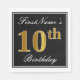 Cette conception simple et élégante de serviette en papier comporte un message comme "10e anniversaire du prénom" (avec le "10e" ayant une fausse couleur dorée) dans une zone carré de couleur noire avec une bordure simple. Le nom est dans un texte de type script de couleur blanche, et peut être customisé. Des serviettes comme celles-ci pourraient être utilisées à une fête d'anniversaire pour quelqu'un qui célèbre son dixième anniversaire. [~Z0000136]