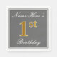 Cette conception simple et élégante de serviette en papier comporte un message comme "Name-Here’s 1st Birthday" (avec le "1er" ayant une fausse couleur dorée) dans une zone carré gris avec une bordure simple. Le nom est dans un texte de type script de couleur blanche, et peut être personnalisé. Des serviettes comme celles-ci pourraient être utilisées à une fête d'anniversaire pour quelqu'un qui célèbre son premier anniversaire. [~Z0000191]