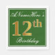 Cette conception simple et élégante de serviette en papier comporte un message comme "AnameHere’s 12th Birthday" (avec le "12th" ayant une fausse couleur dorée) dans une zone carré de couleur verte avec un contour de bordure simple. Le nom est dans un texte de type script de couleur blanche, et peut être customisé. Des serviettes comme celles-ci pourraient être utilisées à une fête d'anniversaire pour quelqu'un qui célèbre son douzième anniversaire. [~Z0000137]