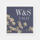 Serviettes en papier mariage magnolias du sud avec un arrière - plan bleu marine foncé de minuit avec les initiales du couple et la date mariage en blanc.