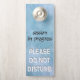 Calm blue background Session in Progress please do not disturb door sign for therapist, counsellor, massage therapist or any business or service that requires privacy. Painted blue background and script font lend a tranquil, peaceful feel to this design. Same design on both sides.