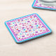 A set of cork-backed coasters, with a pattern of flowers in purple, turquoise, pink and orange on a white background, from a handpainted paper collage by Judy Adamson. You can easily change the background colour, if you wish, by using the Edit button.