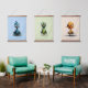 Each panel has a different image of a blue, greenand yellow bird with coordinatingbackground