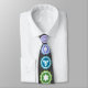 Wear this bold tie to show your awareness and mindfulness of the flow of energy in our bodies and the universe and the need to keep it in balance. The tie displays bold symbols of the seven chakras--Muladhara or root chakra, Svadhisthana or sacral chakra, Manipura or solar plexus chakra, Anahata or heart chakra, Vishuddha or throat chakra, Ajna or third eye chakra, and the Sahaswara or crown chakra--on a charcoal grey background. The Sanskrit word, "Namaste" (I acknowlege the God in you), is written in the colours and order of the seven chakras on the back of the tie as an added spiritual boost. (Just FYI, the tie may appear to be laid out a bit oddly, but that was done in an attempt to ensure that you get the ideal effect when the tie is tied.) I hope you enjoy wearing this tie. Namaste!