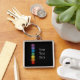 A graphic design of the seven chakras on a premium keychain. The keychain has a text template for your personalization, and the background colour is changeable.