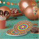 This colourful paper plate features a groovy graphic design inspired by the 1970s with overlapping discs in a rainbow of colours centred with a sun with slightly twisted rays. Edit design to change the background hue.