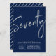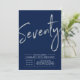 Celebrate your special day with this simple stylish 70th birthday party invitation. This design features a brush script "Seventy" with a clean layout on a navy blue background. You can customize the text and background colour. More designs available at my shop BaraBomDesign.