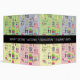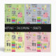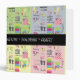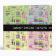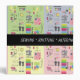 Squares in pastel green, yellow, blue and pink. Each has images of items related to sewing, crafts, knitting and crocheting