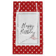 Sewing needle with thread and black stitched frame on red and white polka dot birthday.