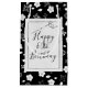 Sewing needle with thread and black stitched frame on black and white floral print for 60th birthday.
