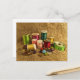 This colourful postcard displays the tools of the seamstress. Bright spools of thread in rainbow colours of green, red, pink, turquoise, yellow, gold, blue and orange stand beside a measuring tape, thimble, buttons and pins. All are set on an image of a brown burlap pattern background.