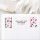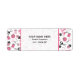 An address label featuring a sewing themed design consisting of a sewing machine, spools of thread, a pin cushion, scissors, fabric swatches, and sewing needles. Design has a pink colour scheme.