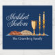 Shabbat Shalom sparkling wine label in beautiful blue with elegant write script above a lovely Shabbat dinner setting with challah bread, wine, and candles. May you have many blessings. Personalize this gift with your family name for a good Sabbath.