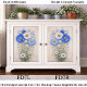 A charming shabby chic botanical composition featuring a bouquet of large blue and ivory flowers arranged against a softly textured vintage background. The blooms resemble stylized daisies and garden flowers, with layered petals in shades of cobalt blue, sky blue, and creamy white. Each flower has a decorative golden center reminiscent of antique brooches or vintage jewelry, adding a subtle touch of elegance and sparkle.