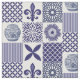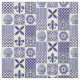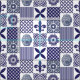 Shabby chic boho blue and white patchwork fabric, patterned with ginger jars, sunflowers, fleur de lys lillies and moroccan trellis tiles.