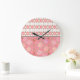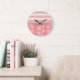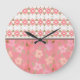 Kitchen, nursery or bath decorative wall clock with pink flowered mixed patterned design accented with hearts. The white and or pink background can be switched to any colour to compliment your home decor.