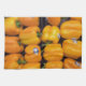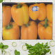 The display of mustard yellow on this Kitchen Towel is an original photograph by ZoeSPEAK of yellow bell peppers for sale in a produce market. The peppers' colours are a palette of the varieties of mustard. Yellow green pepper stems and blue and white produce stickers accent the neat rows of the fruit.