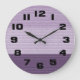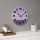 This unique wall clock features three shades of purple on a quilted brick background, surrounded by big, bold, black numbers.
