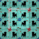 A silhouette Pug with a scattering of bones and paw tracks. This design is intended to tile seamlessly.