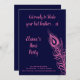 A large peacock feather in fuchsia decorates this Hens Party Invitation on an navy blue background with the cute saying, Get Ready to Shake your Tail Feathers! making it perfect for a night on the town dancing to celebrate the bride.