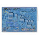 The traditional Passover greeting, "Shalom Pesach", is shown in Hebrew letters with ornamental flourishes on a textured background, primarily in shades of blue