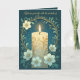 A tall Sham candle glows with a steady golden flame, its wax adorned with delicate filigree. Encircled by pale blue blossoms and curling vines, the composition blends warmth, elegance, and a serene, almost celestial atmosphere, evoking light, joy, and contemplation.