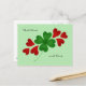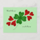 A pretty postcard featuring a lucky shamrock with red hearts on a mint green background and room for text.