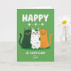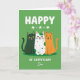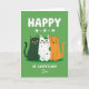 This card features an emerald-green background that sets a St. Patrick’s Day scene, with three cute cats centered like close friends posing for a photo 💚. The left cat is deep forest green with bright yellow eyes and a tiny pink tongue showing, leaning into the group with a teasing, affectionate look. In the middle, a white cat with shamrock-green spots sits snugly between the others, its small smile and pink nose giving it a sweet, gentle presence ☘️. On the right, a warm orange cat mirrors the left cat’s shape, creating a cozy, balanced trio that feels connected and companionable. Near the top, the word “HAPPY” appears in rounded white letters, with small white shamrocks spaced around it. Below the cats, “ST. CATTY’S DAY” is written in white, and the word “Son” sits underneath in a thinner, flowing green font. The cats have simple shapes with flat color fills, crisp dark outlines, and bright yellow eyes that stand out against the green field. Four little white shamrocks float near the top text, framing the headline against the solid background.