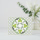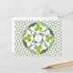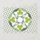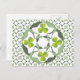 This postcard features a Celtic inspired pattern of interlocking curved shapes in muted green hues is interspersed with brighter green shamrocks or three leaf clovers along with a larger version of the motif and clover shapes that symbolize St. Patrick’s Day and the Holy Trinity.