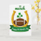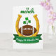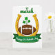 This card shows a white background with a golden horseshoe centered around an American football, its brown surface and white stitching drawn with crisp detail. A small bunch of green shamrocks rises from the top of the football, like a lucky little bouquet that two friends might grin over as they plan to watch the game together ☘️. Near the top, the text “17 march” sits above the main image in deep emerald lettering. The central layout feels balanced and close-knit, with the horseshoe curving protectively around the football and pulling your eye inward. Along the bottom, a wavy green banner stretches across the width, carrying the message “Happy St. Patrick’s day” in white letters. The palette stays focused on green, gold, brown, and white, giving the design a festive look without extra clutter 💚. The banner’s gentle wave, the shamrock cluster, and the football’s stitching create a tidy stack of shapes from top to bottom.