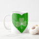 A modern design featuring two shining, green hearts with sparkling shamrocks inside on a white background. Mug with a customizable design for you to personalise with your own background colour, text, pictures and ideas. Available in all style options. Created using original photographs and digital techniques by Jess Perry.