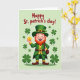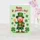 This card shows a cheerful leprechaun facing forward against a pale green background, his wide smile and rosy cheeks giving him a friendly, welcoming look 💚. He wears an emerald outfit with a tall hat topped by a small cluster of shamrocks, and his fiery red beard frames his open-mouthed grin as if he’s greeting someone he’s glad to see. Scattered shamrocks and four-leaf clovers float around him, creating a light, festive setting that feels like a lucky day shared with friends ☘️. In his left hand, he holds up a shiny gold coin marked with a dollar sign, like he’s teasing a little secret about where the treasure might be. The coat, vest, and trousers are detailed in shades of green, while his brown boots stand out with yellow laces and a gold buckle that catches the light. Near the top, the message “Happy St. Patrick’s Day!” appears in red lettering, centred above his hat so it’s the first thing you read. Small clovers in different sizes dot the background evenly, with the leprechaun placed right in the middle of the scene.