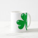White mug with an illustration of a shamrock, or hop clover, symbol of Ireland and of St. Patrick's Day (a legend says that the saint used it to explain the Holy Trinity). Various sizes and styles to choose from.